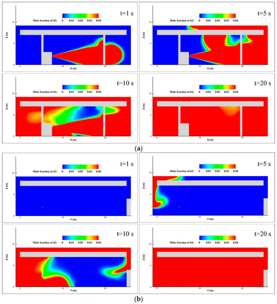 To gain a deeper understanding of the diffusion behavior of hydrogen, profiles of flammable gas cloud in the x-z plane and y-z plane are shown in Figure 17. According to Figure 17a, it is observed that the flammable gas cloud first expands in the jet direction and then expands above the canopy. With time increasing, hydrogen diffusion towards the back of the leakage hole and occupied the entire region at 20 s. According to Figure 17b, at the initial stage, hydrogen has not yet diffused to the transverse plane of the leak hole. At 5 s, the profile above the canopy expands along the +y direction, and then expands towards the -y direction due to the wall obstruction. The entire region is occupied by the profile at 20 s.