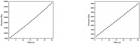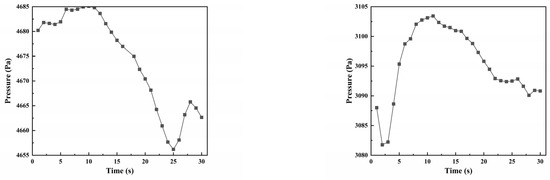 Figure 20 shows the time history of the local maximum pressure exerted on the canopy in a Typical HRS. Once hydrogen is released vertically into the atmosphere, the pressure remains almost constant over time. Compared to the 10 × 10 mm leak hole, the pressure of the 5 × 5 mm hole is lower, thus the impact is smaller.