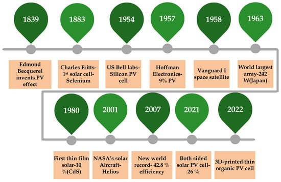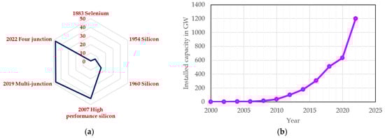 Before the 19th century, solar thermal energy was used for various applications. The first milestone in the development of solar energy into electricity was the invention of the photovoltaic effect by Edmond Becquerel. Figure 1 shows the timeline for the history of PV cells and their growth till the 23rd century. Every year, researchers report a drastic increase in the efficiency of solar cells by working on the material and its properties. The efficiency rise in solar cells from 1883 to 2022 is presented in Figure 2a. The efficiency has increased from 1% to 47.6%. In Figure 2a, the efficiency of various solar cells in the research and development stage is presented. In fact, these types of solar cells are not commercially available. Figure 2b exhibits the exponential rise of global PV installed capacity, demonstrating that the growth rate of production and installation capacity is 26% per year between 2016 and 2022. The global installed PV capacity was 1.2 GW in the year 2000 and increased to 1200 GW by 2022.