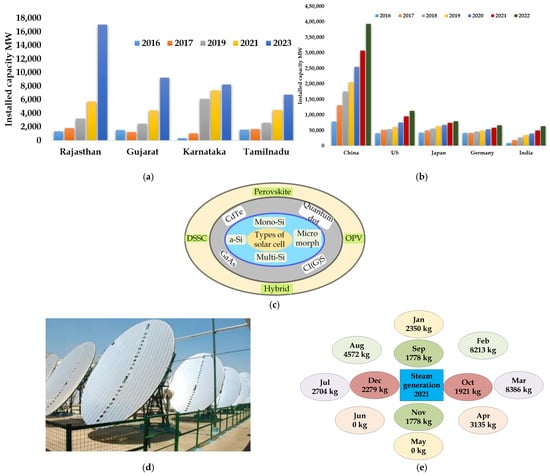 (a) Growth of solar power installed in states of India (b) Growth of solar power installed in five countries (c) Types of solar cells (d) Solar thermal power plant in SRMIST (e) Steam generation in kg from concentrated solar plants.