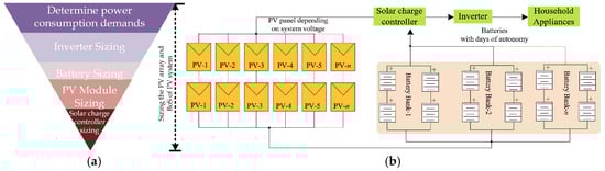 Figure 5a gives the steps involved in designing a standalone rooftop PV system. The initial step in creating a solar PV system is to evaluate the overall electrical power and energy consumption of all the loads the system will accommodate. The inverter for standalone systems must be adequately sized to accommodate the total power requirements. It should be 25–30% larger than the combined wattage of the appliances. For motors or compressors, the inverter must have a capacity of at least three times that of those devices. Furthermore, the inverter capacity should be increased to handle the surge current during startup. In battery sizing, the total watt-hour per day is calculated. The number of batteries required is acquired by considering days of autonomy, inverter efficiency, and the rating of the battery. PV module sizing is carried out by considering the charge controller and battery efficiency [21]. The amp-hour required is obtained by considering the system voltage. Finally, the solar charge controller rating takes the short-circuit current of the PV module. The current rating of the controller circuit is determined by growing the short-circuit current by 1.3 times. The complete schematic circuit after the design of the PV system is presented in Figure 5b.