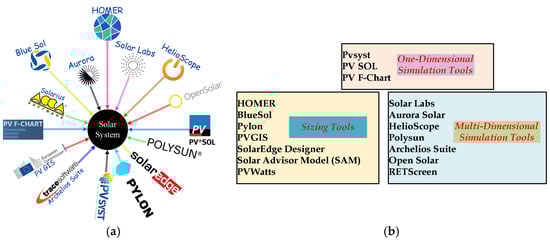 In this regard, the feasibility and modeling of the PV system have been studied in this paper by using different Simulation Software, and they are used to analyze the 52 kW PV grid located in the SRM Institute of Science and Technology in Chennai, India. Figure 6a presents various simulation tools used by many researchers, suppliers, and customers for the installation of PV systems. Grid-connected PV systems are a good alternative source of electricity for developing countries. The capacity of a PV grid for a particular location can be evaluated by using different Simulation Software. This study mainly concentrates on the comparison of various PV tools. Thus, in this study, a few simulation software is used, such as TEDA, MNRE PV GIS, SISIFO PV*SOL, and PVSyst, to analyze the 52 kW grid-connected PV system of the SRM Institute of Science and Technology Mechanical “C” block (Kattankulathur, Tamil Nadu). A comprehensive analysis and the inferences from the study are obtained and presented. This article will help the researchers to use suitable software for the analysis and study. This review will also help in improving the PV system’s precision. Simulation software is categorized based on sizing, one-dimensional, and multi-dimensional simulation tools, and these three groupings are depicted in Figure 6b.