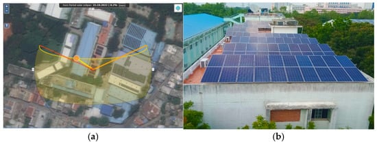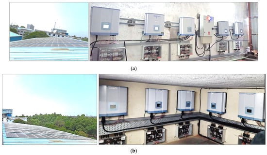 In this section, the performance ratio (PR) of three plants commissioned by SRM Institute of Science and Technology is calculated and presented in Table 5. Figure 11a,b presents the photographs of solar panels installed in three different locations and their inverters. Figure 11a presents the photo of rooftop solar panels placed in Aerospace hangar with its string inverters. Similarly, the rooftop panels with string inverters placed in Mechanical hangar is depicted in Figure 11b. For the calculation of the performance ratio, we tabulated the energy yield obtained from those two PV plants, and PR is acquired using the following expressions.