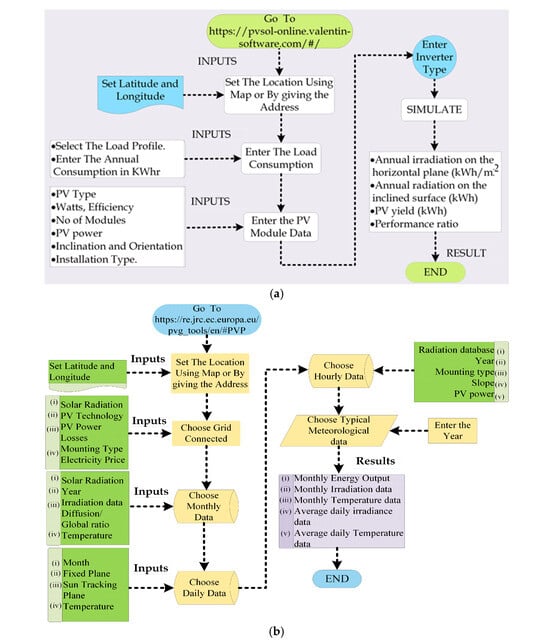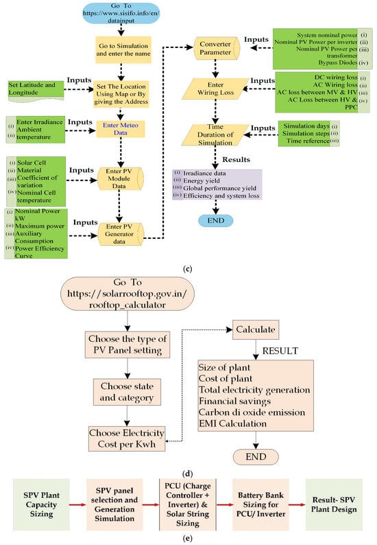This tool is designed by one of the state Governments (Tamil Nādu) in India. The step-by-step procedure for the design of on and off-grid-connected PV systems using the TEDA tool is offered in Figure 8e.