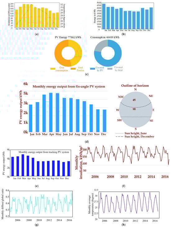 PV*SOL is an efficient tool that is used to decide the type and capacity of PV to be installed. The location and PV data are entered as the input in the online PV*SOL software to obtain the results, such as annual PV energy, irradiance data, and energy consumption. The detailed flow chart of steps is shown in Figure 8a. From this flow diagram, it is observed that this tool provides PV yield and performance ratio as the result. The PVSOL gives the annual global irradiance and average temperature of the location, and the result is presented in Figure 9a,b. The annual global irradiance is about 1941.9 kWh/meter square and an average temperature of about 28.2 degrees Celsius. The data are taken and absorbed, and the maximum power consumed is about 46,409 kWh; thus, we obtain the corresponding Energy curve in PV*SOL. From the given input, the PV consumption and generation are obtained and illustrated in Figure 9c,d.