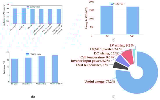 SISIFO is an online-based simulation used for the overall simulation of a PV system. The systematic procedure is shown in the form of a flowchart, which is depicted in Figure 8c. IES-UPM created SISIFO, a free online simulator for photovoltaic systems, as part of the PVCROPS European project. The simulation of various grid-connected photovoltaic systems, including large grid-connected plants and building-integrated installations, is possible with this version of SISIFO. Compared to PVSOL and PVGIS, this tool provides efficiency and system loss along with the global performance yield. SISIFO is used to obtain many parameters of the PV Grid, and the obtained irradiance for a year is shown in Figure 9i. The energy yield for AC and DC power is obtained in the year as shown in Figure 9j. The performance ratio in percentage is presented in Figure 9k. Finally, the useful energy with various losses is presented in Figure 9l.