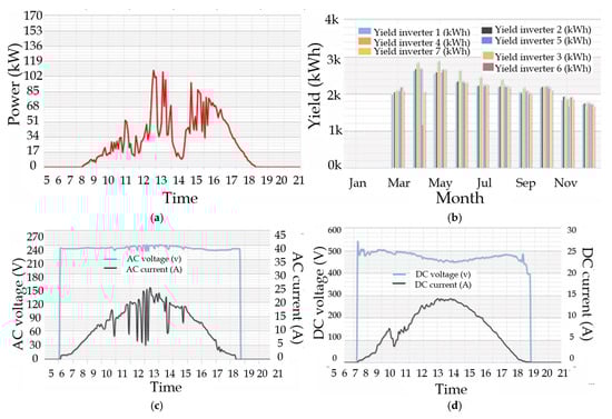 Results obtained from online monitoring system (a) AC power output (b) Energy yield (c) AC voltage and current (d) DC voltage and current.