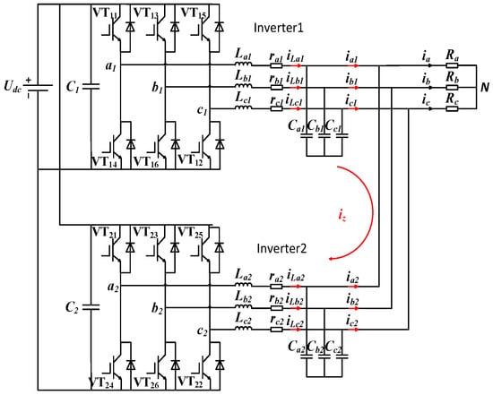 Energy storage systems can stabilize the fluctuation of renewable energy outputs within a microgrid [1,2] and are an important aspect of distributed generation. As the interface of energy transmission in the microgrid, inverters are of great significance. With the development of distributed generation, there is an increasing demand for high-power energy transmission. Inverter parallel technology has become an effective solution to improve the energy transmission capacity [3,4]. However, the zero-sequence circulating current (ZSCC) induced by the direct parallel connection of inverters causes output current distortion, reduces system efficiency, and can even lead to system collapse [3,4,5,6,7,8]. Therefore, the ZSCC problem is critical and must be solved to ensure the stable operation of the parallel inverter system.