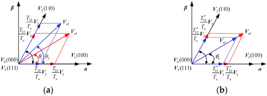 In Figure 2a, the angle between the combined space vector Vs1 of inverter 1 and the α axis is θ1, the angle between the combined space vector Vs2 of inverter 2 and the α axis is θ2, and the amplitudes of Vs1 and Vs2 are the same. It is easy to obtain that the difference in the on-time of the three-phase bridge arm of the two inverters is Δt11, Δt21, and Δt31.