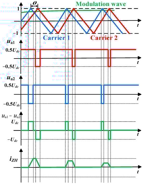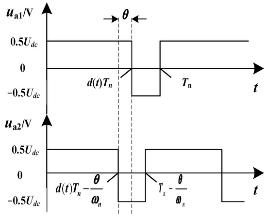 Taking the difference in the independent clock between each inverter into consideration, the carrier phase difference will accumulate with time. When it reaches 180 degrees, the amplitude of the high-frequency ZSCC is at its maximum. In order to reveal the mechanism of the high-frequency ZSCC, the A-phase modulation wave and the carriers of two inverters are analyzed in detail. Figure 3 shows the output voltage when the modulation wave is consistent and the carriers have a phase difference angle of θ.