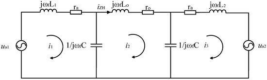 ua1 and ua2 are the instantaneous output voltages of the A-phases of inverter 1 and inverter 2, respectively. Assuming that the filtering parameters of the two inverters are the same, where angular frequency ωf = 2πfs and fs is the switching frequency, L1 is the filtering inductance, L0 is the connection inductance between the two inverters, and iZH is the switching HF-ZSCC. Since iZH = i2 and using the mesh current method, the peak value of the HF-ZSCC is obtained in (11),