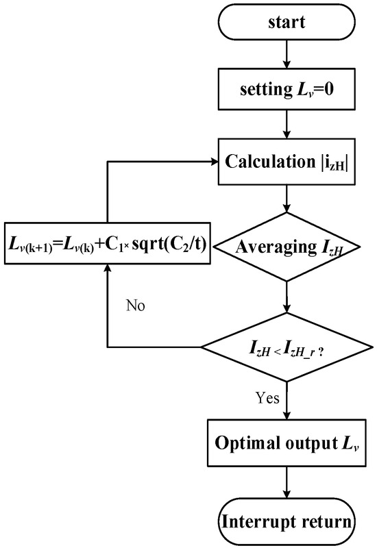 Because there are positive and negative values in the HF-ZSCC, it is necessary to calculate the average value after taking the absolute value of the HF-ZSCC. After that, this strategy determines the value of virtual inductance by judging whether the average value IzH of the HF-ZSCC decreases or not. In order to obtain the optimal virtual inductance value faster, the flowchart in Figure 10 is used to determine the optimal virtual inductance value. The constants C1 and C2 need to be determined according to the timing of adding the virtual inductor. The purpose of this is to make the HF-ZSCC suppression effect become faster in the early stage of adding the virtual inductor and reduce the increasing speed of the virtual inductor in the later stage so as to obtain the optimal virtual inductor value and obtain the best suppression effect of the HF-ZSCC. In the decision, the measured or calculated average current IzH is compared with the reference current IZH_r. If the IzH < IZH_r, then the ZCSS is suppressed and the flowchart is judged into outputting optimal Lv. On the contrary, it will be in the next Lv iteration.