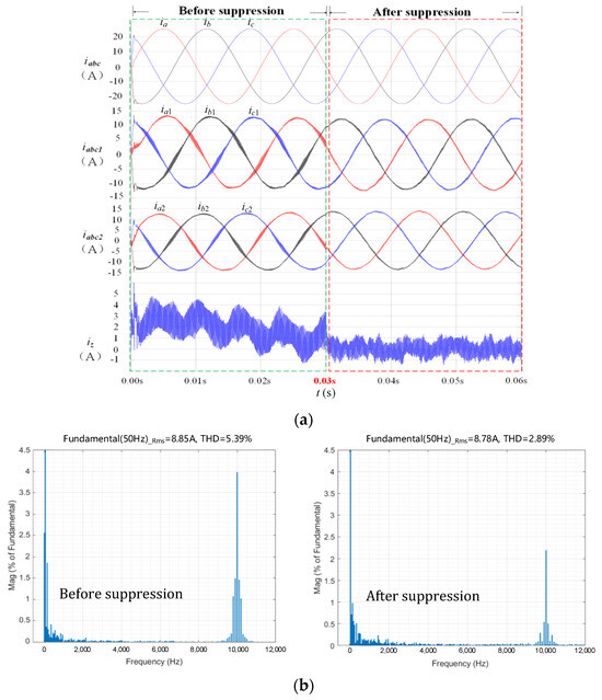 During 0–0.03 s, the A-phase output current total harmonic distortion (THD) of inverter 1 and inverter 2 are 5.39% and 4.75%, respectively, due to the 180° carrier phase difference between the two inverters. It can be seen that the A-phase output current of the two inverters contains a DC component and a low- and high-frequency component, which is caused by the ZSCC, and the ZSCC effective value is 2.82 A.