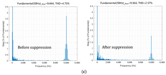 Figure 14 shows the key waveforms and current harmonic contents of the parallel inverters with no ZCSS suppression control and with the proposed composite suppression control strategy. The total output power of the parallel inverter in this test is 6 kW, which differs from the 12 kW simulation output power shown in Figure 12. This discrepancy occurs because inverter 1 operates above its rated 6 kW capacity without ZCSS suppression. From Figure 14a, it can be seen that the RMS of the ZSCC is 1.74 A, the output currents of the A-phase of the inverters are ia1 = 5.13 A and ia2 = 4.18 A, and the current iTHD is 9.63% and 7.26%, respectively, i.e., each parallel inverter outputs different power. After adding the proposed ZSCC suppression strategy, from Figure 14b, it can be seen that the RMS of the ZSCC is 0.95 A, the output currents of the A-phase of the inverters are ia1 = 4.66 A and ia2 = 4.65 A, and the current iTHD is 4.25% and 4.04%, respectively. The ZSCC is effectively suppressed by about 45%, and each of the parallel inverters operates with approximately the same output power.