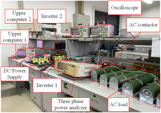 In order to verify the proposed ZSCC composite suppression control strategy, a parallel system prototype with two inverters is built with the DSP28335 digital controller and PM75cl1a120 power module based on the parameters outlined in Table 1. The experiment platform is shown in Figure 13. In the prototype, the used sampling rate is 40 kHz under 10 kHz of switching frequency. The average ZCSS current is calculated once every 25 switching periods, i.e., the suppression control frequency is 10 kHz/25 = 0.4 kHz. The executing time is about 1 us excluding the iteration program in the flowchart shown in Figure 10, and the total execution time of the whole control program is about 55 us.
