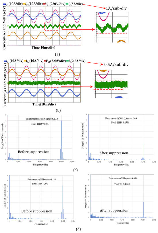 Key waveforms and current harmonic contents of the parallel inverters at a total output power of 6 kW. (a) Key waveforms with no ZCSS suppression; (b) key waveforms with the composite suppression control strategy. (c) A-phase current harmonic contents of inverter 1. (d) A-phase current harmonic contents of inverter 2.