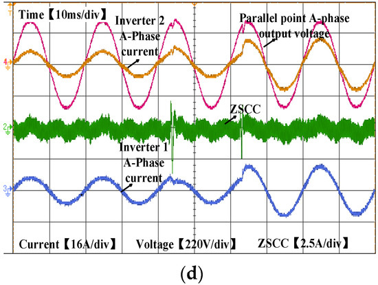 Figure 15 shows the key waveforms of the parallel inverters with the proposed composite suppression control strategy under step load change. The total output power of the parallel inverter ranges from 6 kW to 12 kW, i.e., each of the parallel inverters operates under a full load of 6 kW at a total output power of 12 kW. In Figure 15b, the output currents of the A-phase of the inverters are ia1 = 4.68 A and ia2 = 4.62 A, and the current iTHD is 3.8% and 3.5%, respectively, at a total output power of 6 kW. In Figure 15c, ia1 = 9.32 A and ia2 = 9.26 A, and the current iTHD is 2.82% and 2.56%, respectively, at a total output power of 12 kW. From Figure 15d, it can be seen that the response time is limited to one cycle and steady. During the whole operation time, the ZSCC stays constant at approximately 0.85 A. The experiments show that the proposed composite control strategy achieves effective suppression on the ZCSS and good adaption under step load change. It can also be seen that there are two change scenarios since there are two large current transients in Figure 15d. This change scenarios happened because the rheochord was used as the AC load shown in Figure 13, and in the step load change experiment, the rheochord load of the three phases could not be precisely changed at the same time by manual operation. The second transient current was caused by A-phase load change.
