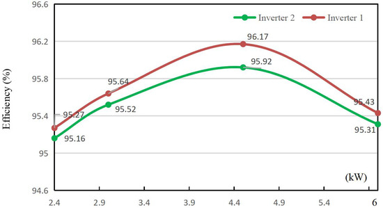 The efficiency of the parallel inverters with the proposed ZCSS composite suppression control strategy was also tested, as given in Figure 16. The efficiency test aims to show that the designed two parallel inverters can operate steadily, and efficiency is one of the key parameters of the inverter. The tested efficiency will further validate the inverter’s performance. If there exists a high ZSCC in the parallel inverters, it will cause each inverter to have unequal output power. Because the inverter efficiency varies with output power, the efficiency will be affected. In the worst case, it may cause some of the parallel inverters to operate with overload, wherein the efficiency will be affected greatly. In our experiments, the designed rated output power of each inverter is 6 kW. When the total output power is above 10 kW without the proposed ZCSS composite suppression control strategy, inverter 1 will operate over 6 kW with overload due to the ZCSS effect; then, the efficiency cannot be tested. Thus, only the efficiency with the proposed ZCSS suppression is provided, and the efficiency without ZSCC suppression cannot be provided.