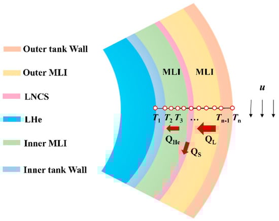 Considering the heat transfer from the tank wall, the vacuum gap between the LNCS and the inner layer, and the vacuum gap between the outer tank wall and the outer layer, the tank wall–vacuum multilayer adiabatic layer–vacuum gap heat transfer model can be established, as shown in Equations (2)–(6):