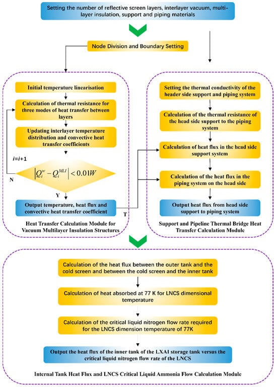 The heat transfer calculation model of the LHe-4 tank includes the heat transfer module of the vacuum multilayer adiabatic layer and the heat transfer module of the thermal bridge, and MATLAB 2021a is used for the programming and solving. Figure 2 shows the flow chart of the LHe-4 tank heat transfer model. The heat transfer model of the adiabatic structure mainly includes the heat transfer calculation of the adiabatic structure, the heat transfer calculation of the thermal bridge, the heat leakage calculation of the inner tank, and the calculation of the maximum and minimum critical liquid nitrogen flow rates of the liquid nitrogen screen. When carrying out the heat transfer calculation of the adiabatic structure, the temperature distribution of the multilayer adiabatic structure is updated by using Equation (26), and the calculation is iterated repeatedly until the residual difference between the heat flux on the wall surface of the outer tank and the heat flux of the outer adiabatic layer are less than 0.01 W.