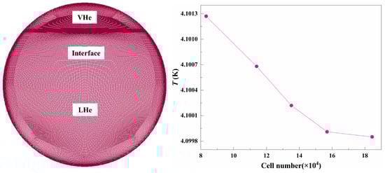 The LHe-4 tank studied in this thesis is a large horizontal tank, and the diameter of the cylindrical part of the tank is 3 m. Since the thermal response phenomenon mainly occurs in the cross section perpendicular to the axis of the tank, to save the cost of numerical computation, the central cross section of the cylindrical part of the tank was used as the computational domain to carry out the study of the thermal response characteristics. Based on the ICEM meshing platform, a structured mesh was established, and the mesh at the gas–liquid interface was encrypted with a determinant quality of 0.95. At the same time, considering that the natural convection near the wall surface of the tank was the main focus of the thermal response characteristics study, the mesh near the wall surface was encrypted. The computational domain and meshing results are shown in Figure 3.