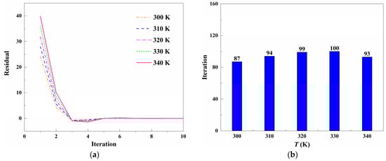 The heat transfer calculation results of the adiabatic structure of the LHe-4 tank under the natural convection boundary conditions are shown in Figure 6. Analyzing Figure 6a, the residual curve decreases sharply in the first three iterations, and the residual is less than 10−3 when the iteration is carried out to the 10th step. Figure 6b shows the number of iterations at each temperature. Analyzing Figure 6c, the existence of the LNCS leads to an interruption in the temperature distribution of the tank insulation structure, the temperature gradient of the outer insulation layer gradually decreases from the inside to the outside, and the value of its temperature increases with the ambient temperature. The higher the ambient temperature, the higher the temperature gradient at the outer side of the cold screen. At the same time, when the ambient temperatures are 300 K, 320 K, and 340 K, the temperature differences between the outer wall surface of the storage tank and the environment are 0.287 K, 0.349 K, and 0.425 K, which shows that the temperature difference rises with the ambient temperature, and when the ambient temperature rises by 1 K, the temperature difference increases by 0.003–0.004 K, and the gradient of the temperature difference increases with the increase in the ambient temperature.