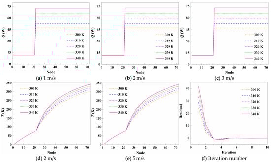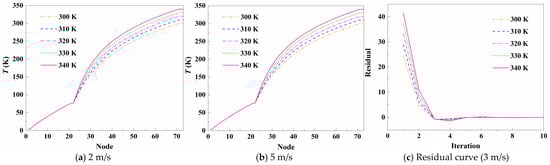 The temperature distribution of the multilayer adiabatic structure of the LHe-4 tank is shown in Figure 7. The analysis shows that the temperature distribution law of the adiabatic structure under the forced convection boundary condition is the same as that under the natural convection boundary condition. The temperature difference between the vacuum sandwich between the cold screen and the inner adiabatic layer and between the outer tank and the outer adiabatic layer is smaller, which is because the vacuum sandwich has only radiative heat transfer and its thermal resistance is smaller than that of the adiabatic structure. Under the boundary condition of forced convection, the influence of the ambient temperature on the temperature distribution of the adiabatic structure of the storage tank is more significant than that of the wind speed of forced convection. When the wind speed is 2 m/s and the ambient temperatures are 300 K, 320 K, and 340 K, the temperature differences between the outer wall surface of the tank and the outside environment is 0.047 K, 0.061 K, and 0.078 K, respectively, and when the wind speed is increased to 5 m/s, the temperature differences are 0.022 K, 0.029 K, and 0.038 K, respectively. It can be seen that the increase in the ambient temperature results in the temperature difference between the outer wall surface and the environment increasing gradually, while the increase in the wind speed leads to the temperature difference between the outer wall surface and the environment increasing gradually. It can be seen that an increase in the ambient temperature leads to a gradual increase in the temperature difference between the outer wall and the environment, while an increase in the wind speed leads to a gradual decrease in the temperature difference between the outer wall and the environment. The calculated residuals at different wind speeds are less than 10−3 after 10 steps of iterative calculations, and the residual curves at a wind speed of 3 m/s are shown in Figure 7c.