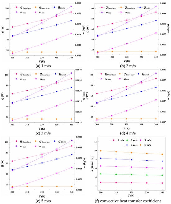 Figure 9 shows the results of the heat transfer calculations for the storage tank under the forced convection boundary. Analyzing Figure 9a–e, it can be seen that the heat flux of the outer adiabatic layer increases in an approximately linear manner due to the increase in the ambient temperature, and the effect of the wind speed on the heat flux of the outer adiabatic layer is much smaller than that of the ambient temperature, which is because the vacuum degree of the adiabatic layer is 10−3 Pa, the daily evaporation rate is 0.39%, and the adiabatic performance is better. When the ambient temperature is 300 K and the wind speeds are 1 m/s, 3 m/s, and 5 m/s, the heat fluxes of the outer adiabatic layer are 64.460 W, 64.488 W, and 64.494 W, respectively; and the corresponding heat fluxes when the ambient temperature is 340 K are 72.760 W, 72.816 W, and 72.831 W. In addition, under the same ambient temperature, the rate of the heat flux increasing with the wind speed decreases gradually, and the higher the temperature, the higher the rate of the increase in the heat flux. However, due to the formation of a cold wall in the LNCS, the heat flux of the inner adiabatic layer remains constant. Analyzing the critical liquid nitrogen fluxes of the LNCS in Figure 9a–e, the maximum and minimum critical fluxes of the LNCS are positively correlated with the ambient temperature due to the significant increase in the heat flux of the outer adiabatic layer with the temperature. Taking the convection velocity of 5 m/s as an example, when the ambient temperatures are 300 K, 320 K, and 340 K, the maximum critical liquid nitrogen flow rates of the LNCS are 2.406 × 10−3 kg/s, 3.061 × 10−3 kg/s, and 3.840 × 10−3 kg/s, respectively, and the minimum critical flow rates are 1.604 × 10−3 kg/s, 2.041 × 10−3 kg/s, and 2.560 × 10−3 kg/s, respectively. It can be seen that, to absorb the heat flux increment of the outer adiabatic layer caused by the increase in the ambient temperature, the maximum and minimum critical liquid nitrogen flow rates increase with the increase in the ambient temperature, and the gradient of the critical flow rate increases gradually with the ambient temperature increase.