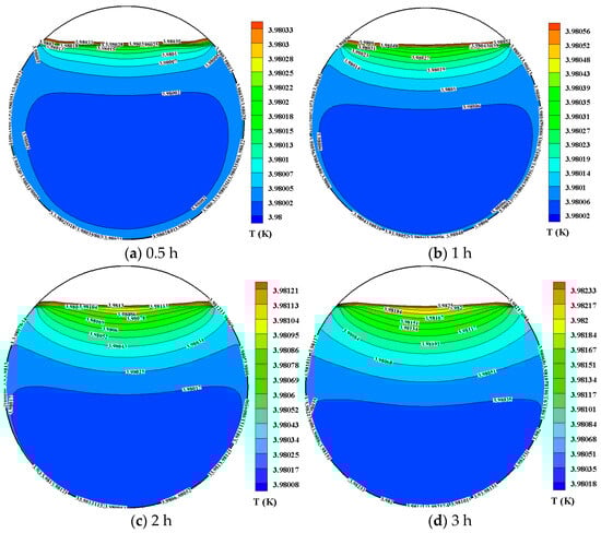 The temperature distribution in the liquid-phase region at different moments is shown in Figure 10. It can be seen that with the numerical calculation, the high-temperature zone at the gas–liquid interface of the storage tank continuously extends to the inside of LHe-4. Taking the 3.9805 K isotherm as an example, the 3.9805 K isotherm is 0.02 m above the gas–liquid interface at 1 h, while the isotherm is 0.93 m below the gas–liquid interface at 3 h. This is because the heat at the wall surface of the tank is transferred to the free-liquid surface by natural convection, and the heat is gradually transferred to the LHe-4 below the free-liquid surface. At 3 h, a stable isotherm and temperature gradient are formed in the tank (i.e., thermal stratification is formed).