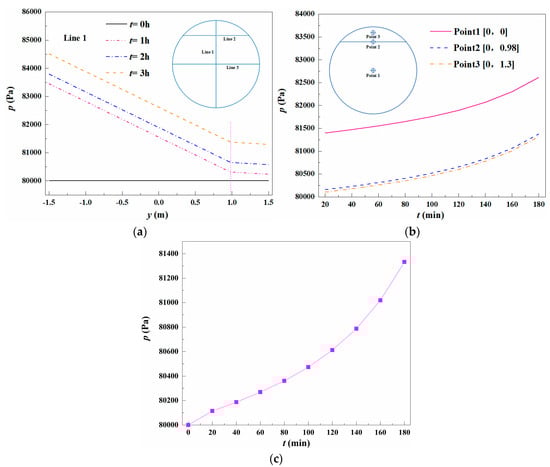 Figure 13 shows the pressure distribution in each path and monitoring point of the storage tank. It can be seen that along Line 1, the pressure distribution in the gas-phase region of the storage tank is uniform, but there still exists a slight gradient, which is due to the low temperature of the VHe-4. The pressure in the liquid-phase zone is distributed in a linear pattern, and the increase in the gas-phase pressure leads to the corresponding increase in the liquid-phase pressure, as shown in Figure 13a. The pressures at the bottom of the tank at 1 h, 2 h, and 3 h are 83,451.7 Pa, 83,795.3 Pa, and 84,515.8 Pa, respectively, which are much higher than those in the gas-phase zone, and therefore the bottom of the tank is the most hazardous location inside the storage tank. Analyzing Figure 13b, the pressures at the three observed monitoring points increased with time according to the same pattern, with a small rate of increase in the early stage and a large rate of increase in the later stage. At 100 min, the pressures at Point 1, Point 2, and Point 3 were 81,758.80 Pa, 80,518.69 Pa, and 80,465.83 Pa, respectively.