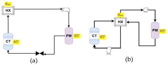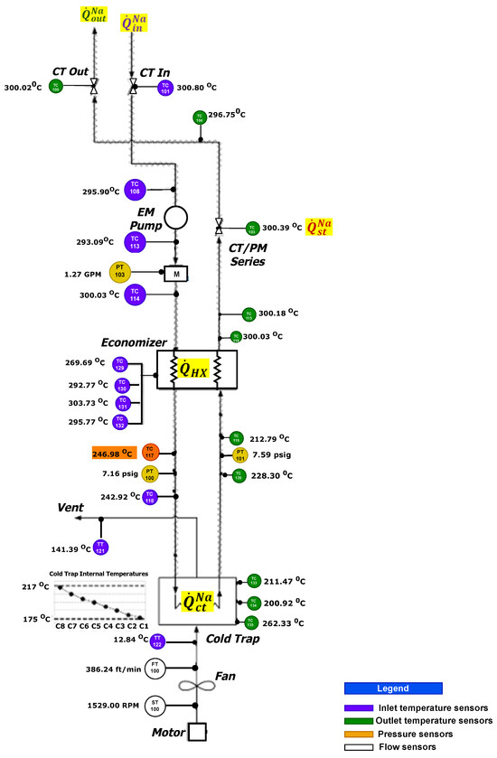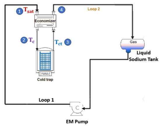 - The first section of the cold trap (CT) control volume considers the incoming sodium from the inlet of the economizer, which acts as an exchanger that adds or removes the required energy with heat rate , and the outlet of the EM pump that enters into the CT with heat rate . Some negligible energy loss to the environment occurs.