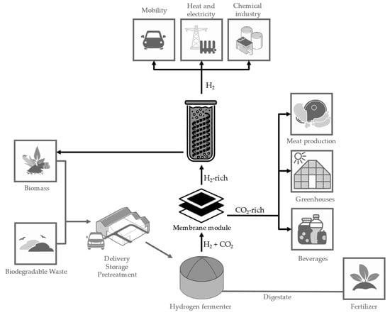 In the proposed concept, a mixture of H2 and CO2 is produced via dark fermentation. While the digestate can be used as fertilizer, the product gas must be purified to produce H2 suitable for various processes, e.g., fuel-cell processes. An algae reactor is proposed to purify the H2 and simultaneously utilize some of the CO2 produced in dark fermentation. To avoid CO2 limiting the growth rate of the microorganisms, a membrane module is used to pretreat the product gas by decreasing the CO2 content. The CO2-rich stream has a CO2 molar fraction of 0.84 and can be used for various processes, e.g., CO2 enrichment in greenhouses, to stun animals, as preservative gas, or for carbonation in beverages. The H2-rich stream is fed to the algae reactor, where the microorganisms metabolize the remaining CO2 by mainly producing biomass.