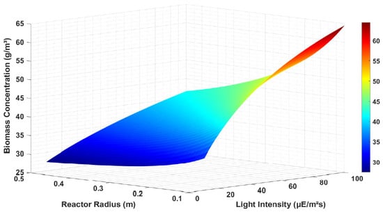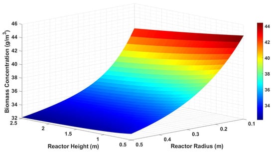 For instance, the solution set obtained for the highest purity of H2 of 98.42% is {600 μ E m−2 s−1, 4.99 × 10−5 m3 s−1, 0.3 m, 3.5 m}. The solution set for the highest biomass concentration of 1915.74 g m−3 is {599.95 μ E m−2 s−1, 4.99 × 10−5 m3 s−1, 0.10 m, 1 m}. The balanced solution set obtained, {599.95 μ E m−2 s−1, 5.01 × 10−5 m3 s−1, 0.15 m, 3.48 m}, will yield a H2 mole fraction of 95.88 and a biomass concentration of 1331.72 g m−3. The point highlighted with the red circle in Figure 5 is the solution set with values {599.86 μ E m−2 s−1, 5.019 × 10−5 m3 s−1, 0.1 m, 3.48 m}. By comparing the solution set of the maximum H2 mole fraction and the point highlighted with a red circle, the effect of the radius and height of the reactor on the H2 mole fraction can be seen. Gas separation is the main priority here, so proceeding with the solution set corresponding to the maximum H2 mole fraction would be a good option. Thus, the design and operating parameters of the reactor are assumed according to the solution set obtained.