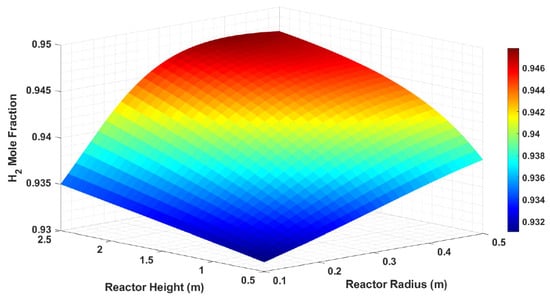 It was observed that most solution sets favoring the maximum mole fraction of H2 are at the higher reactor height and higher radius, whereas the solution sets favor the biomass concentration at a lower reactor radius. The optimal solution sets obtained by performing optimization are given in Table 4.