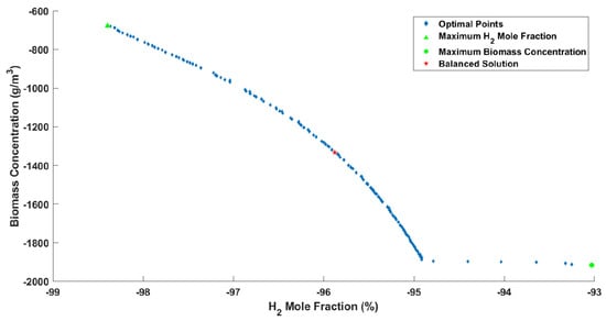 Each point on the Pareto front represents an optimal solution for one of the two objectives. The decision to proceed with a particular solution set will depend on the priority of the objectives. For instance, if the mole fraction of H2 is of more priority, choose the optimal solution set with the maximum H2 mole fraction. If the biomass concentration is of more priority, then choose the solution set with the maximum biomass concentration. Choosing the balanced solution set is viable if both objectives are of equal priority. In Figure 5, the point highlighted with a green triangle represents the solution set for the maximum H2 mole fraction, and the point highlighted with the green circle represents the maximum biomass concentration, whereas the point highlighted with a red star represents the balanced solution obtained by calculating the Euclidean distance with respect to the center. It should be noted that the negative signs in the axis are due to the conversion of the objectives to minimization functions.