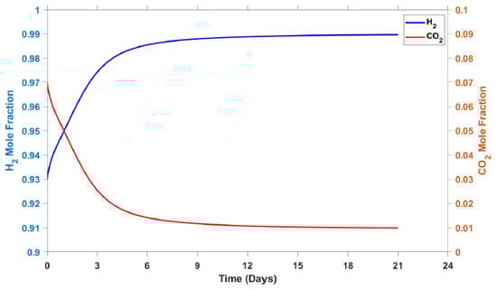 As shown in Figure 8, the CO2 removal efficiency increases over time, reaching 85% after one week under optimal conditions. The gradual increase in CO2 removal efficiency is closely tied to the algae’s CO2 consumption rate, which stabilizes over time as the system approaches a balance between the inlet CO2 rate and the mass transfer limitations. The changes in CO2 and H2 mole fractions over time highlight how the gas dynamics within the reactor—such as the residence time, gas flow rate, and light availability—affects the CO2 fixation process.