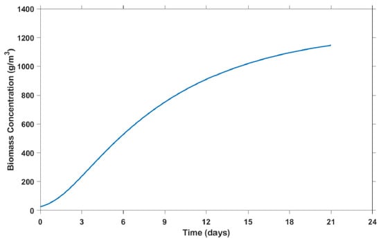 Figure 7 represents the variation in biomass concentration over a duration of three weeks. This plot is also obtained at the optimal maximum H2 mole fraction parameters. The biomass concentration is raised from an initial value of 25 g m−3 to around 1145 g m−3 in three weeks. The growth of microalgae is relatively small when compared with the growth rate at optimal conditions, which was grown to around 1915 g m−3 in the initial seven-day duration, as seen in Figure 5.