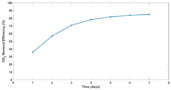 Figure 8 depicts the CO2 removal efficiency of the reactor at various timepoints. Since the reactor operates at continuous gas flow and photosynthesis is a slow process, the concentration of the CO2 at the outlet changes over time. As a result, the CO2 removal efficiency will also vary depending on time. The CO2 removal efficiency of the reactor was obtained at the optimal conditions, and the value rose from 35% from day one to around 85% after one week.