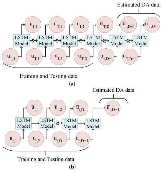 The conventional use of LSTM from Figure 1a is modified as shown in Figure 1b. This allows us to capture rare events and increase the overall accuracy of the model. Since pattern recognition at each time interval t is assessed on a daily basis, this modified version of the network is qualified as diurnal and named DLSTM. Considering uncertain variable , a daily prediction approach is used instead of solving the hourly time series prediction problem. Thus, the vertical analyses of time-series data can be transformed into a matrix-based prediction with T rows and D columns corresponding to time intervals t and days d, respectively. As shown in Figure 1b, the estimated data for each row with the same time slot t are collected as the DA forecast data .