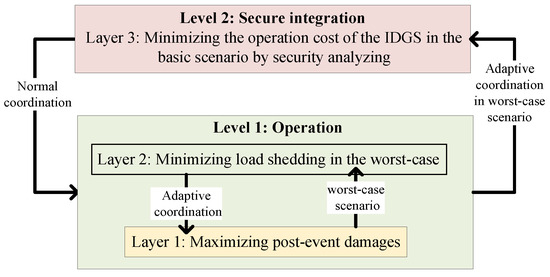 For the system considered in this contribution, the resilience of the ADS can be enhanced by adding GTs to appropriate buses, as a backup. Since ADS has the priority to supply CLs, their configuration, location, and ratio in the post-event situation must be modeled. The optimal resilience-oriented operation problem can be mathematically formulated using a tri-layer two-level approach. Level 1 includes determining the maximum value of as the worst-case (Layer 1) and identifying the best coordination points (Layer 2). Layer 3 then checks the security validation of the IDGS plan in the Level 2 process. Details of the proposed model are described in the following subsections.