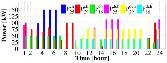 where , , and are the amounts of power generated from RESs, and are active and reactive load demands, and and are the charging and discharging powers of ESS, respectively. Symbols r and x mark resistance and inductance, while I and U represent the squared magnitudes of current and voltage, respectively. The superscripts and are the maximum and minimum limitations.