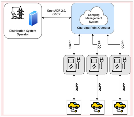 Threats associated with vulnerabilities in EV charging infrastructure have received significant attention in recent literature [22,23,24]. As discussed in Section 1, the coordination of EV charging requires complex communication architectures to address both consumer and grid constraints. Effective coordination necessitates data exchange among three key actors using this communication architecture: the distribution system operator (DSO), the charge point operator (CPO), and EV users. The DSO shares grid constraint data with the CPO to enable flexibility services, while the EV user communicates arrival time, departure time, and state-of-charge (SoC) information with the CPO to optimize charging schedules and leverage EV flexibility. A multitude of communication protocols exist that enable communication between these different actors; a summary is provided in [25] along with the level of maturity and interoperability. Figure 1 depicts how these protocols can be employed to establish communication between the different actors.