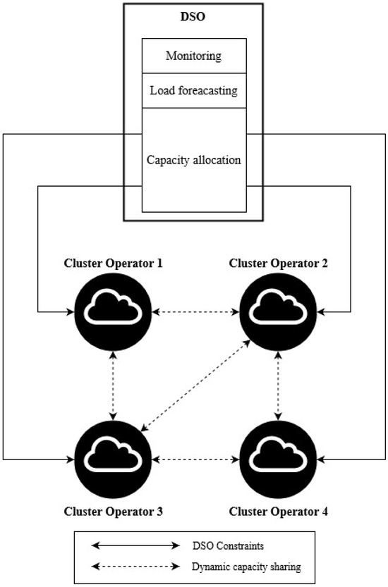 This work assumes a hierarchical grid management concept that consists of two levels. On the higher level, the DSO monitors the system loading in the distribution grid in real time. The charger cluster operators at the lower level are tasked with managing EV charging schedules within specific Low-Voltage (LV) sections. Their primary responsibility is to regulate the aggregate load under each secondary substation, ensuring it stays within limits acceptable to the corresponding Medium-Voltage/Low-Voltage (MV/LV) transformer and the capacity of the MV feeders. The DSO determines capacity constraints (i.e., the DSO constraints), , which is a vector where each parameter specifies the upper limit of the power that the charger cluster c is allowed to consume at time t. The cluster operators apply as optimization constraints in the optimized smart charging problem, further explained in Section 4. When the cluster operators do not receive any input from the DSO due to cyber–physical disruptions, they employ peer-to-peer communications amongst themselves to determine their dynamic capacity constraints. This hierarchical concept is illustrated in Figure 2.