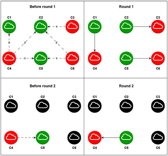 It is important to note that there may exist scenarios where a server receives requests from multiple equally distant clients at once. In this case, the server is allowed to send offers to both clients. Should a client receive offers from multiple servers in a single round, it prioritizes the closest server’s offer. An example of this scenario can be seen in the first round in Figure 3. Here, C5 sends offers to both C4 and C6. However, at the same time, C4 receives an offer from C1 as well. While C4 quickly stalls the offer of C5 and accepts the offer of C1, C6 quickly accepts the offer of C5. In this case, C5 closes a deal with C6 in the first round. Therefore, the capacity that it can offer to C4 in the second round decreases. By default, capacity sharing agreements are achieved by considering the estimated disruption period. However, this poses a risk for the clusters that provide capacity to other clusters. In case new EVs connect to the chargers of the cluster that agreed to share its surplus with another cluster, the service potential of the “capacity provider cluster” would suffer from reduced supply potential. Likewise, the sudden disconnection of an EV can reduce the actual capacity demand of a capacity consumer. The strategies that quantify the risk and benefit of capacity sharing are not within the scope of this work. Therefore, it is assumed that the capacity agreement can be terminated upon the decision of one of the involved clusters. In any case, both capacity consumers and providers are allowed to make new agreements.