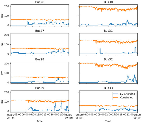 Above is the auxiliary binary variable that helps spot the position of in the SoC curve of the EV battery. Constraints (4) and (5) ensure that the SoC of a single EV has to be in a particular SoC range. In other words, for the EV whose battery SoC is within the range represented by r at t (i.e., ), the rule applies while for all other r. In (6), the charge power constraints are separately modeled for each SoC range r. Here, are auxiliary variables indicating the power that the EV battery charges (for >0) or discharges (for <0) if its SoC is in the range r at t. in the inequality ensures that is non-zero only for a particular r for v at t. Constraint (7) ensures that —which represents how much power is supplied to v during and thus determines —is equal to the for the r where holds true.