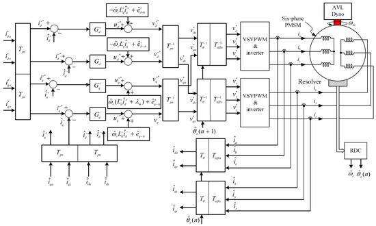 In modern applications, both three-phase and six-phase PMSMs are widely utilized across industrial and consumer sectors [1,2,3,4,5,6,7,8,9]. In recent years, the control of six-phase PMSMs has garnered significant attention, with numerous studies demonstrating the advantages [10,11,12]. Therefore, these benefits will not be further elaborated on in this paper. The fundamental specifications of the six-phase PMSM under test can be found in Appendix A Table A1. The motor is controlled using common-mode and differential-mode current control strategies [13]. Specifically, the control involves summing and subtracting the dq-axes currents of the two three-phase sets within a six-phase system, following the principles of field-oriented control (FOC) [14,15].