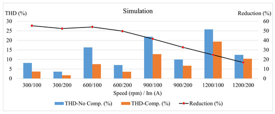 Figure 5a shows the simulation results at 900 rpm with a peak phase current of 200 A, without back-EMF harmonic compensation, revealing current waveform distortion. In contrast, Figure 5b shows improved waveform quality with back-EMF harmonic compensation under the same conditions. Figure 6 summarizes and compares the THDs of all scenarios, demonstrating the effectiveness of back-EMF harmonic compensation in reducing current harmonic distortion and enhancing motor drive stability.
