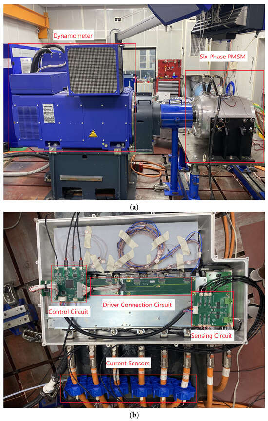 Photos of the six-phase PMSM testbench: (a) Setup with the dynamometer driving the six-phase PMSM. (b) Six-phase PMSM drive system.