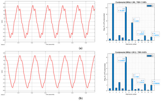 Figure 8a illustrates the actual performance without the incorporation of back-EMF harmonic compensation, demonstrating the effects of harmonics on the system’s response. Conversely, Figure 8b presents the performance under identical speed and current commands but with harmonic compensation applied, highlighting the improvement in waveform fidelity. The THD of the current is summarized and compared in Figure 9, providing quantitative evidence of the effectiveness of harmonic compensation in reducing distortions and enhancing system performance. This comparison clearly demonstrates the positive impact of back-EMF harmonic compensation on system stability and control precision.