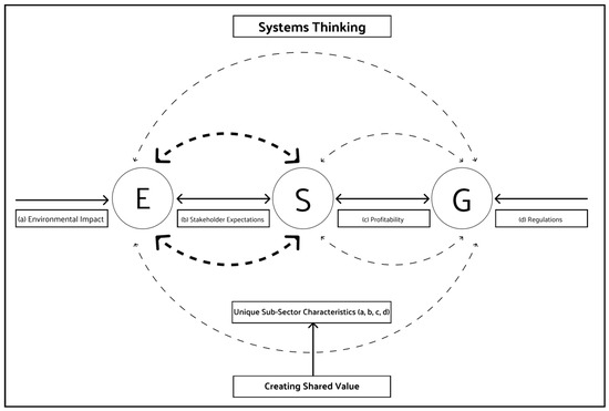 Considering the two approaches, the pillars of ESG, environmental (E), social (S), and governance (G) represent distinct yet interconnected aspects of a company, purposefully assembled with the weighted average of these three pillars [58], aligning with a systems thinking approach [10]. Also, while ESG focuses on the non-financial aspects of companies, high ESG performance leads to better overall performance, including financial performance, such as net profitability and stock return performance [59]. As CSV aims to enhance economic performance while considering environmental and social factors [16], taking these two approaches into account will enhance the comprehension of the system. Furthermore, the literature has indicated that improvements in one ESG dimension may positively impact others. For example, in [60], it was concluded that environment investments increased social satisfaction in China by reducing air pollution, and [13] concluded that corporate wildlife habitat programs boosted employee morale, enhanced relationships with environmental groups and communities, and improved regulatory compliance. It was also obvious that the impact works in multiple directions, as stakeholders—including governments, regulators, clients, and NGOs—exert pressures on firms to adopt environmental management practices beyond regulatory requirements [14,61]. Moreover, governance applications, such as enhanced access to environmental risk and gaining maturity in corporate environmental governance, enhance stakeholder relations [62,63].